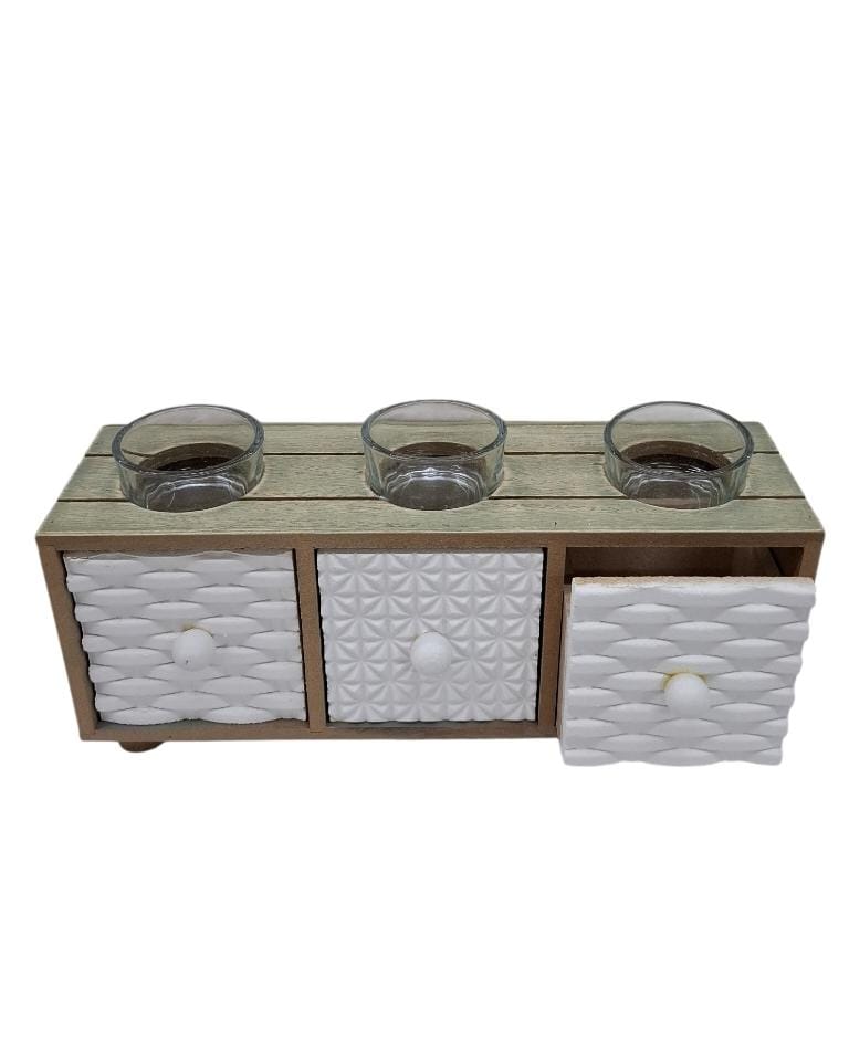 Adorno madera e portavelas vidrio 23×11 con 3 cajones