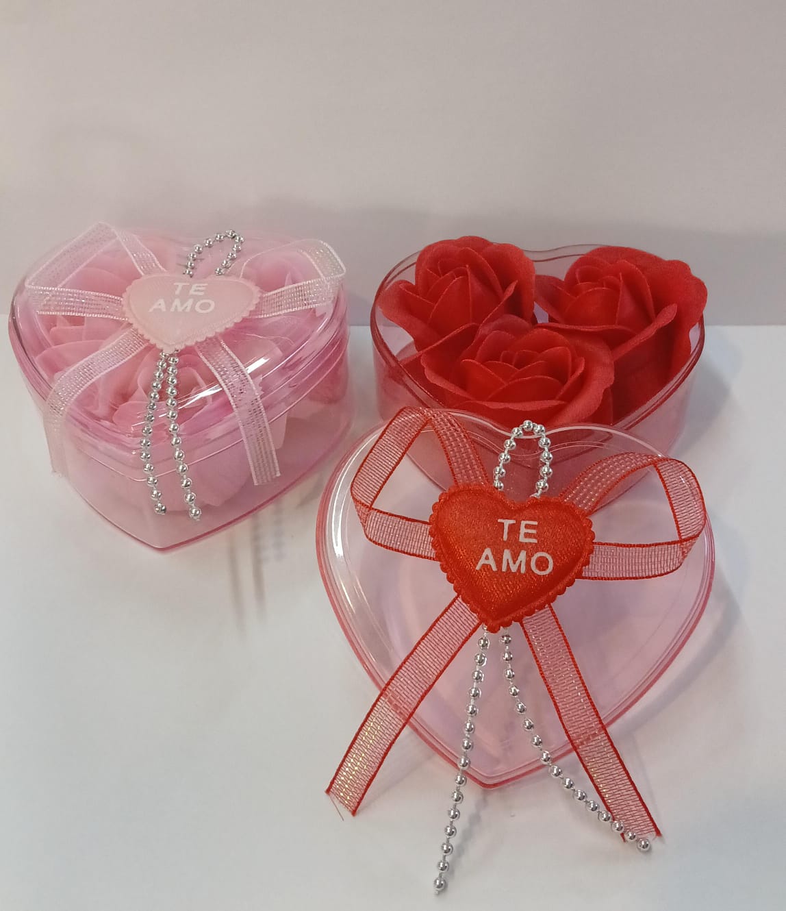 Caja acrilica corazon 8×5 con petalos y aplique TE AMO