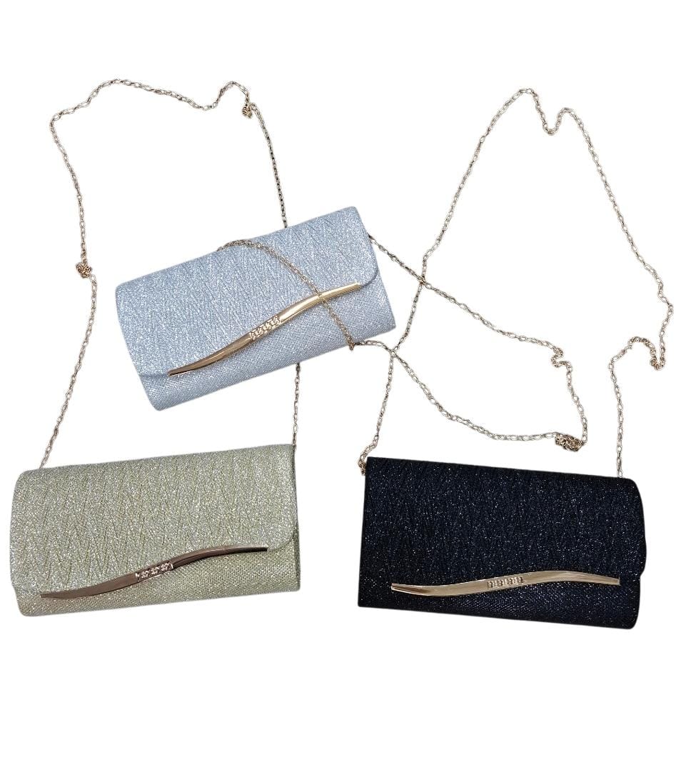 Cartera de fiesta 24×12 con aplique dorado y tira cadena