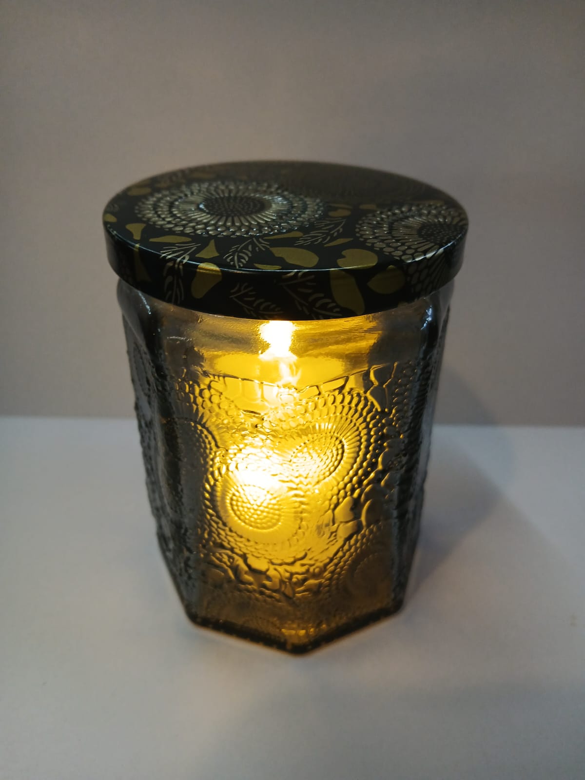 HERMOSO FRASCO PORTAVELA VIDRIO 7X8 CON TAPA